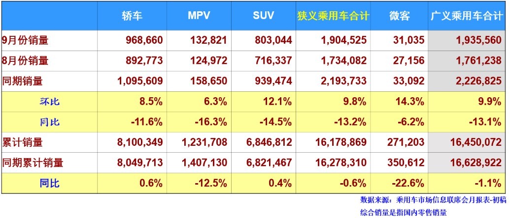9月份传统汽车销售同比下降13.1%